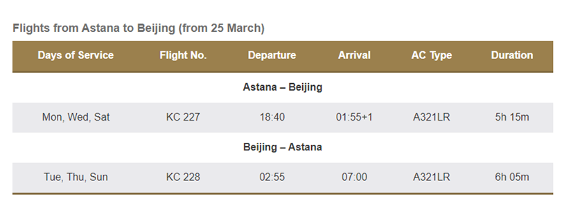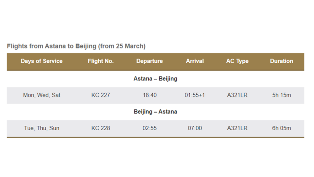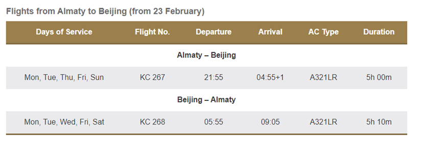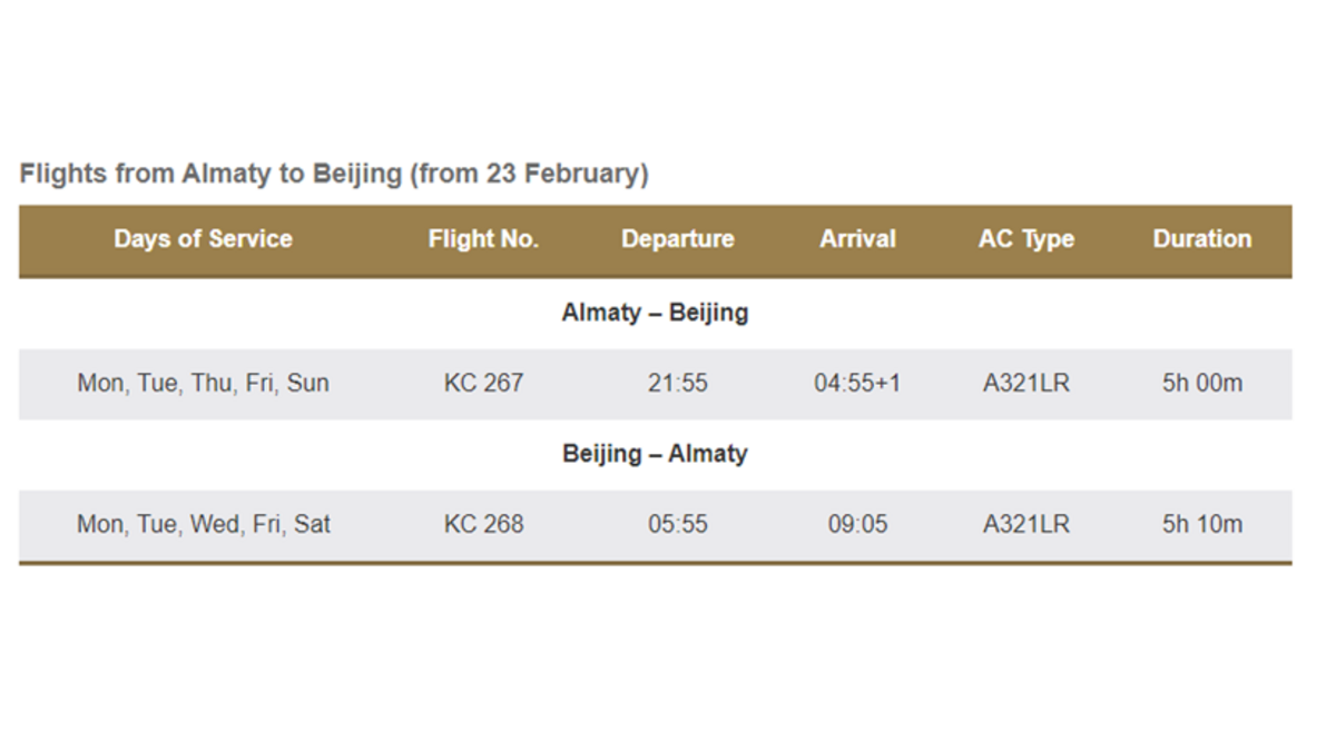 La fréquence des vols au départ d'Almaty sera portée à cinq fois par semaine à partir du 23 février et les vols au départ d'Astana reprendront le 25 mars 2023.