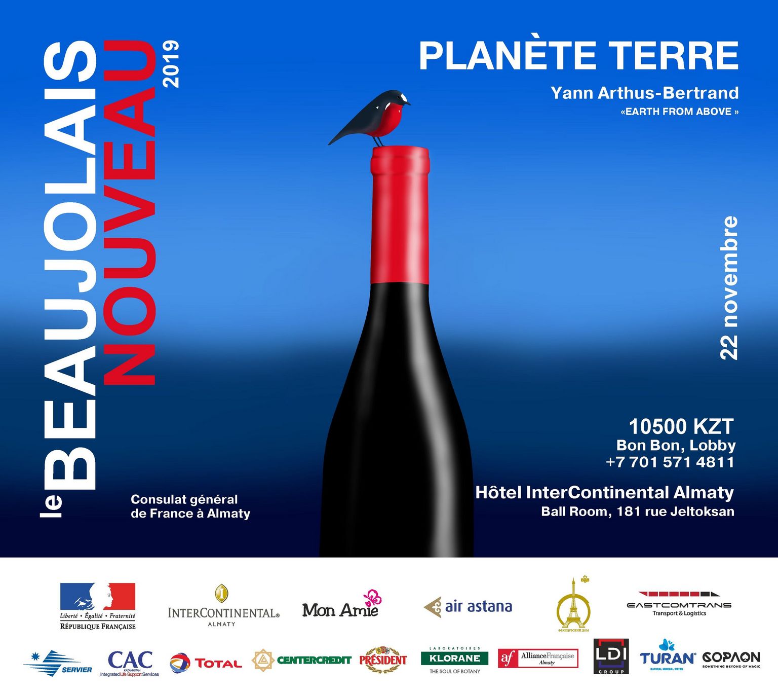 Le Consulat général de France à Almaty et l'InterContinental Almaty ont le plaisir vous convier à la fête du 10ème anniversaire - Le Beaujolais Nouveau, qui se tiendra